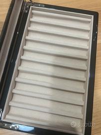 Elegante portapenne da collezione realizzato in legno con finitura nero lucido e bordo dorato. Il coperchio in vetro trasparente consente di esporre con stile fino a *10 penne o stilografiche*, mantenendole ordinate e protette. L’interno è rivestito in velluto beige, con *10 scomparti sagomati* che offrono una protezione sicura da urti e graffi. Ideale per collezionisti o come raffinato complemento da scrivania.