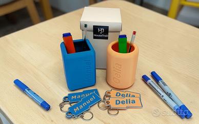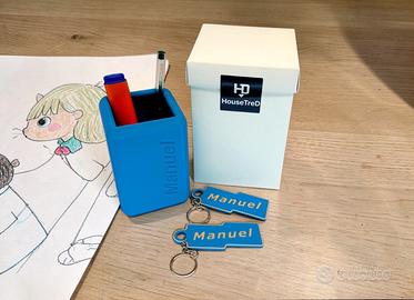 Portapenne e Portachiavi personalizzati con nome, perfetto per i tuoi bambini ,per rendere unica la loro scrivania o per fare un regalo originale. Disponibile in forma quadrata e rotonda. PERSONALIZZAZIONE Al momento dell'ordine comunica il NOME che desideri , la FORMA (quadrato o rotondo) e il COLORE : disponibile nei colori ROSA PESCA e AZZURRO/TURCHESE Se preferisci altri colori prova a chiedere ,ne ho anche altri. Ogni oggetto viene realizzato su ordinazione, quindi potrebbero esserci leggere variazioni che rendono ogni pezzo unico. Portapenne e Portachiavi vengono spediti in una scatola regalo bianca (tipo bomboniera) , protetta da un'ulteriore scatola esterna oppure protezione di pluriball. DIMENSIONI I portapenne quadrato e rotondo hanno dimensioni 8 x 8 , H 11 MATERIALI E AVVERTENZE: Questo oggetto è stato stampato in 3D utilizzando filamento PLA (Acido Polilattico) , un materiale bioplastico derivato da risorse rinnovabili e ampiamente apprezzato per la sua natura ecologica e non tossica in condizioni di utilizzo standard. Note importanti sulla sicurezza e l'uso: Materiale ecologico: Il PLA è un materiale biodegradabile e non rilascia fumi tossici durante la stampa. Non adatto al contatto alimentare diretto. Cura e pulizia: Per la pulizia, si raccomanda di utilizzare un panno umido. Non lavare in lavastoviglie e non esporre a temperature elevate per evitare deformazioni.