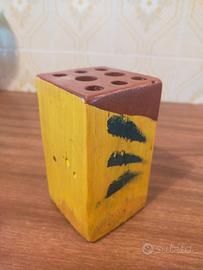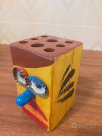 Simpatico portapenne ottenuto con materiali di recupero Il corpo era lo zoccolo di una PALLET (legno di pino). Inserti di materiali vari.