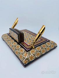 Raffinato portapenne con alloggiamento per biglietti da visita, realizzato in legno pregiato intarsiato secondo l’antica e prestigiosa tradizione persiana del Khatam Kari. Un oggetto di grande fascino, frutto di un lavoro artigianale minuzioso e di alta qualità, pensato per chi desidera impreziosire la propria scrivania con un accessorio elegante e distintivo.