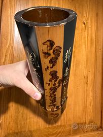 Elegante portapennelli in bambù naturale, finemente inciso e laccato a mano, con iscrizioni poetiche in caratteri cinesi.