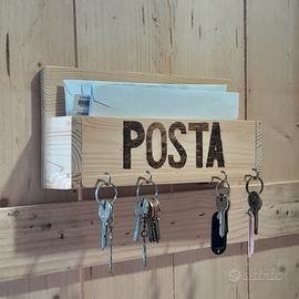 Portaposta e chiavi in legno di riciclo fatto a mano. Lo spazio interno per la posta è di 4x27 cm e alto 6,5 cm. Le misure esterne sono 29x9,5 cm (contando anche i ganci) e altezza 14 cm.