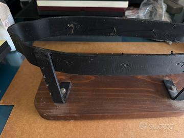 Vendo portaprosciutto antico, struttura robusta in legno con base a forma di spatola da cucina e telaio in ferro nero forgiato. Dotato di manici ergonomici in legno tornito e supporti. Condizioni buone, patina naturale del tempo che ne esalta il fascino vintage anni ’60-’70, ideale per cucine rustiche o collezionisti.