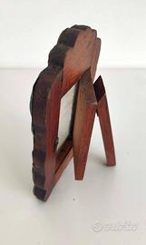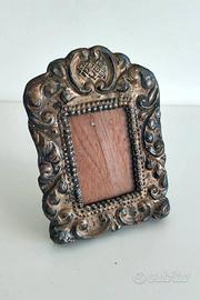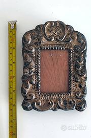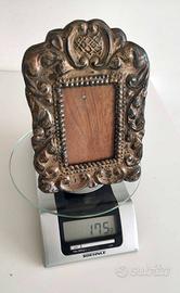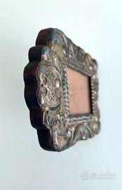 Portaritratti da tavolo vintage in metallo sbalzato stile barocco, su supporto in legno massello. Cornice interamente decorata a sbalzo con motivi barocchi: foglie d'acanto, volute, cartiglio a reticolo in sommità e bordino a perline intorno all'apertura. Il metallo — probabilmente alpacca o ottone argentato — ha sviluppato nel tempo una bella patina scura nelle incisioni che ne esalta il rilievo. Retro in legno duro (noce o simile) con profilo sagomato, cavalletto incernierato e chiavetta di chiusura in metallo. Presenza di vetro interno. Misure: 17 × 11 cm circa Peso: 175 g Apertura foto: circa 9 × 6,5 cm Età stimata: anni '60, probabilmente produzione italiana o spagnola CONDIZIONI Buone. Normale patina da età sul metallo, legno integro, vetro presente. Nessun danno strutturale. #Portaritratti #Vintage #MetalloSbalzato #CorniceBhrocco #Alpacca #CasaVintage #Antiquariato #ArredoVintage #CorniceDaTavolo #Collezionismo