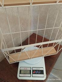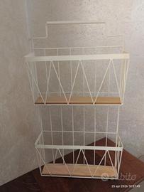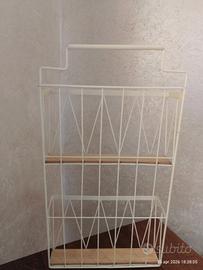Portariviste da parete in metallo color panna con mensoline MDF 2 piani, utile e multifunzionale, per bottiglie, piante, asciugamani, saponi per il bagno, bellissimo in cucina ad esempio con tovaglie e canovacci arrotolati, stile shabby chic, ideale per ogni ambisnte, bellissimo! Nelle foto alcuni esempi di utilizzo, i libri e le bottiglie presenti nelle foto non fanno parte della vendita ma a Richiesta sono vendibili separatamente. Delizioso di grande effetto scenico l'organizzatore è robusto e resistente,capiente in condizioni ottimissime con lievissimi segni qualche piccolo graffio sulla vernice Altezza totale fino al manico cm 61, larghezza cm 33, spessore mensoline interne cm 6,5, spessore superiore di ciascun vano cm 10,5