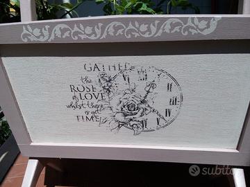 Vendo portariviste in legno e vetro rivisitato in stile Shabby Chic color avorio e rosa antico con stencil e trasferimento di immagini, interni rivestiti con pellicola in pvc lavabile. Il tutto rifinito a cera leggermente anticata.