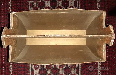 Portariviste vintage in legno dorato decorato in rosso, a scacchi e motivi ornamentali, in stile fiorentino classico molto elegante. Acquistato a Firenze nel 1965, dopo 60 anni presenta scalfitture della vernice (ritoccabili) soprattutto alla base delle zampe, sui fianchi, come da foto, ma la struttura del legno è solida. Ha due comparti con separatore centrale, che funge anche da impugnatura. Prezzo decisamente inferiore rispetto a tutti i portariviste fiorentini esposti sui vari siti, proprio a causa dei segni di usura dovuti al tempo. Dimensioni in cm: H.39; L.38,5; P.21. Per eventuale SPEDIZIONE scrivetemi e valuteremo insieme la scelta più vantaggiosa, poiché è leggerissimo ma le dimensioni suddette superano quelle del pacco “medio” imposte da Subito (50x28x32); forse con Poste Italiane si può rimanere intorno a 10€, con pacco tracciato. Oppure ritiro in loco a TORINO Porta Susa e, occasionalmente, anche ad ASTI o lungo tutto il percorso Torino-Asti della S.S. 10.