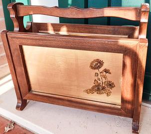 Tecnica decorativa: il mazzo di fiori (crisantemi) è realizzato con la tecnica della pirografia (incisione a fuoco) tipico degli anni '70 che imita il lavoro a mano.