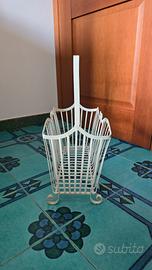 Elegante portariviste in metallo verniciato bianco, di dimensioni: P.20 x H.46 (compreso il manico) x L.38 cm. Caratterizzato da una struttura a griglia robusta e leggera allo stesso tempo. Il design richiama uno stile vintage o shabby chic, ideale per arredare con gusto salotti, studi o camere da letto. Dotato di manico superiore per un facile trasporto, presenta raffinati dettagli decorativi a ricciolo che ne valorizzano l’estetica e lo rendono un complemento d’arredo decorativo oltre che funzionale. Perfetto per riviste, giornali o libri, si integra facilmente in ambienti classici o romantici.
