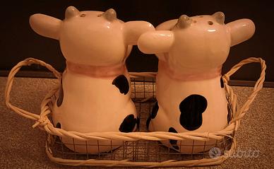 Vendo portasale e portapepe in ceramica a forma di mucca + cestino contenitivo. Mai utilizzati, si trovano nella confezione originale.