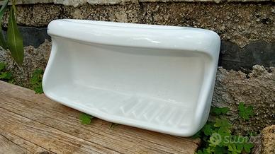 Portasapone in ceramica bianca ANNI '70 da incasso per vasca da bagno o doccia. Dimensioni: Largo 31cm. - profondo interno 8cm. - profondo esterno 10cm. scheggiatura nel lato posteriore da murare quindi non visibile.