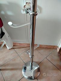 Vendo portasciugamani vintage in plastica e metallo cromato, molto bello. con 2 bracci corti, due lunghi (40cm) e due in cima molto piccoli (es. appendi accappatoio o collane). Base circolare in acciaio. Altezza totale 179 cm.