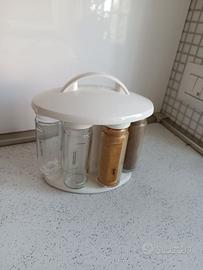 Usato poco, ottimo stato. Etichette presenti. Vasetti in vetro con tappo calamitato, portaspezie con base girevole in plastica dura