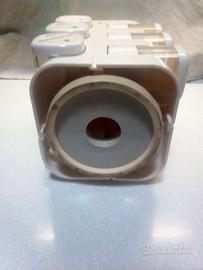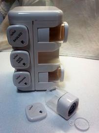 Portaspezie a colonna girevole in plastica bianca con 12 contenitori macinino a base quadrata. Vintage degli anni 80 perfettamente funzionante. Due contenitori hanno le pareti di plastica un po' opacizzate per il contatto con le spezie come da foto. Mancano inoltre 4 tappini posteriori ma non sono indispensabili perchè le spezie escono solo se macinate. Misure: H18,5 - L12 - P12.