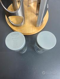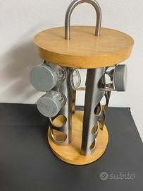 Portaspezie marca Kuchenprofi girevole in legno e metallo. Comprensivo di 16 barattoli in vetro vuoti con le scritte sul tappo cancellate.