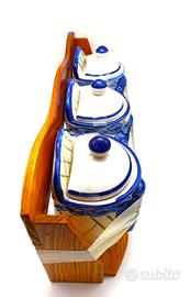 Un complemento perfetto per chi ama le cucine in stile country, shabby o classico italiano. Si adatta bene anche come idea regalo per una casa nuova o per chi colleziona oggetti da cucina vintage e decorati a mano. Spedizione accurata con imballaggio protettivo per garantire l’arrivo sicuro e intatto del set.