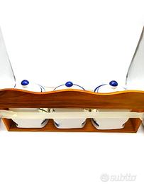 Il tutto è sostenuto da un solido supporto in legno naturale sagomato, che consente di disporre il set ordinatamente su un ripiano o su una mensola. La struttura può essere appesa oppure semplicemente poggiata su una base stabile.