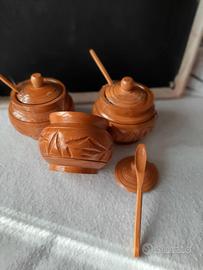 Portaspezie in legno, composto da 3 contenitori con coperchio e cucchiaini. Artigianato delle Filippine. Mai usato.