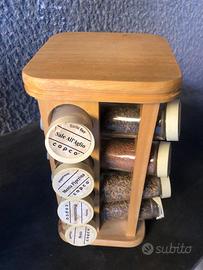 Portaspezie girevole in legno. Manca un barattolino e un coperchio é rotto. Per il resto ottime condizioni.
