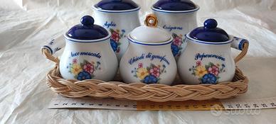 6 vasetti portaspezie : aglio e origano h. 9; noce moscata, peperoncino h.7; chiodi di garofano h.8 ;vassoietto in vimini con manigliette in ceramica