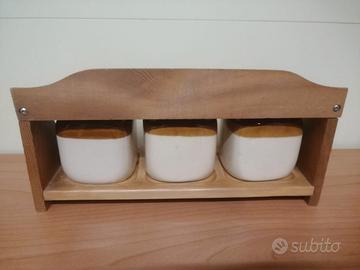 Supporto in legno e contenitori in ceramica con tappo in sughero.