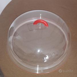 Bellissimo porta-torta Guzzini made in Italy in plastica design elegante e vintage con piatto bordato in rosso e campana con manico rosso, nella sua scatola originale ideale per torte e dolci.