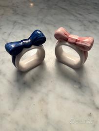 Deliziosa coppia di portatovaglioli in ceramica, decorati con graziosi fiocchi nei toni del rosa e del blu. Pezzi unici realizzati e dipinti a mano, ideali per dare un tocco di colore e originalità alla tua tavola. Perfetti anche come idea regalo o per una mise en place creativa e curata.