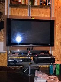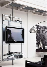 PORTA TV PORADA orientabile con attacco a pavimento rotondo e fornito di doppio attacco superiore: a parete con forcella e a soffitto. Telaio tubolare in metallo satinato e 3 ripiani in vetro temperato. Posteriormente ha una canalina per il passaggio cavi che permette di nasconderli. Retro supporto della TV in grande vetro temperato satinato. Già smontato e con imballo di protezione. Foto reali e foto commerciali di riferimento. Ritiro su Roma.