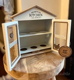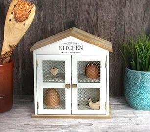 Bellissima casetta portauova in legno. Può contenere fino a 6 uova. Porticine apribili. Nuova mai usata ancora con etichetta.