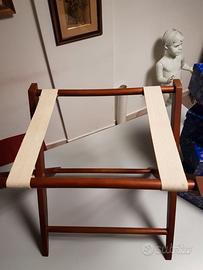 Porta-valigia cavalletto pieghevole salvaspazio,legno di faggio col mogano/ciliegio con cinghie bianche di supporto.NUOVI di fabbrica