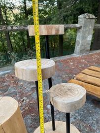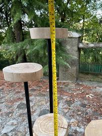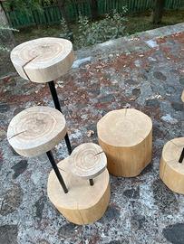 Si compone di tre pezzi, quello centrale è una sezione di tronco di legno lavorato, di diametro di circa 30cm, gli altri hanno le basi dello stesso tronco di quello centrale con alzate di diverse altezze.