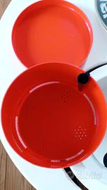 Portavasi vintage arancione in plastica con riserva d'acqua. Modello Classic Round. Non è mai stato usato ma presenta piccoli segno del tempo. Per gli amanti del modernariato space age. Altezza 16 cm. Diametro 22 cm.