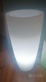Due originali arredi luminosi della linea “Bright” di Monacis/Teknoplast, dalle linee essenziali, eleganti e versatili, resistenti e leggeri: pratico portavaso a cono tronco “Stilo Round”, a luce led bianca, e comodo pouf/sgabello cubico “Comfy Square”, a luce led verde e con seduta cuscinata grigia, entrambi in materiale polietilenico rigido riciclabile, duraturo, indistruttibile, con finitura ad effetto satinato e lampade facilmente sostituibili dalla plafoniera alla base, ideali complementi di home design made-in-Italy sia per esterni che per interno, perfetti, mai usati all'aperto;