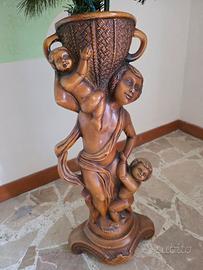 Splendido complemento d'arredo vintage a colonna, perfetto per chi ama lo stile classico e ricercato. Il pezzo è caratterizzato da una struttura scultorea che raffigura figure angeliche (putti/cherubini) che sorreggono un cesto intrecciato, rifinito con eleganti drappeggi. Dettagli Artistici: La finitura è in tonalità ambra/ ocra con sfumature brunite che mettono in risalto i rilievi e i tratti dei volti, donando un aspetto antico e materico. Composizione: Include una ricca composizione floreale artificiale (orchidee e rami di pino) già pronta per decorare un angolo della casa, l'ingresso o un salotto. Stile: Ideale per ambienti Shabby Chic, classici o per amanti del modernariato particolare. Condizioni: Ottime condizioni estetiche. La struttura è solida e ben conservata, con una base decorata molto stabile Misure : Altezza circa 57cm
