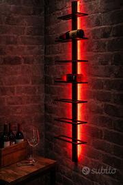 Realizzato con una struttura verticale in metallo dal carattere industriale, si sviluppa in altezza con mensole minimaliste che sostengono le bottiglie in modo elegante e sicuro. L’illuminazione LED rossa integrata, posta lungo l’asse centrale, crea un suggestivo effetto rétro-illuminato che valorizza le forme e dona profondità alla parete, soprattutto su superfici in pietra o mattoni.