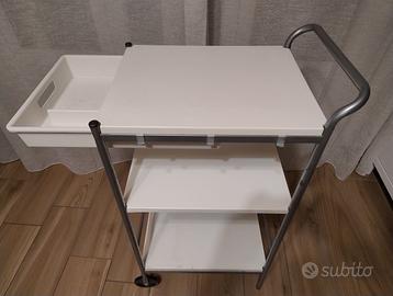Portavivande IKEA Bygel con struttura leggera in metallo e plastica. Dotato di un pratico cassetto sotto il piano superiore e tre gancetti posizionabili. Altezza 90cm. Dimensioni ripiani 40x50cm.