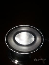 Portavivande ovale, con pietanziera. In acciaio. Molto ben tenuto e ancora funzionante. Misure: 14,5x12,5x10 cm.