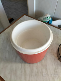 Portavivande per il pranzo fuori casa, con doppio scompartimento, in buono stato, manca la guarnizione al coperchio reperibile a pochissimo prezzo. Altezza cm. 19, diametro cm.16