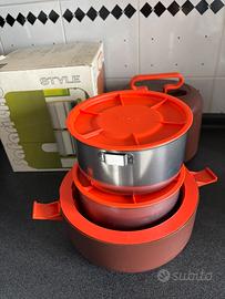 Portavivande termico, nuovo con scatola originale, mai usato, altezza 23 cm diametro 21 cm, colore marrone e arancione. Prezzo 15€.