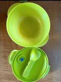 Pratico portavivande Tupperware, ideale per trasportare i tuoi pasti. - Colore verde brillante con dettagli blu. - Design compatto e funzionale.