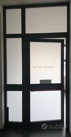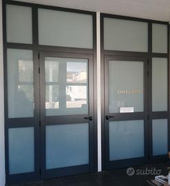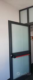 Due porte in alluminio, color antracite, e vetro, color latte 6/7, antinfortunistico, con maniglione antipatico e maniglia esterna. Misure porta e vetrata laterale cm 150x220, Lucernaio 150x78. Prezzo unitario