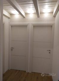 porte interne tamburate verniciate laccate bianche con 2 filetti orizzontali in alluminio satinato, complete di cassa in massiccio e coprifilo. ferramenta di serie con anuba bianche, serratura e incontro colore argento marca agb ita.porte normalmente a magazzino su misure standard e cassa 11 cm. per fuori misura tempistica 5-6 settimane. a magazzino teniamo Battiscopa i in legno massiccio sempre laccati colore delle porte su sez. unica mm 70 x 10 a becco di civetta. ? 3 /ml trattiamo inoltre per la casa finestre in pvc e legno , portoncini blindati interni e esterni. non esitate a contattarci