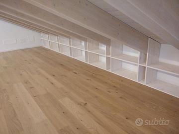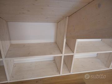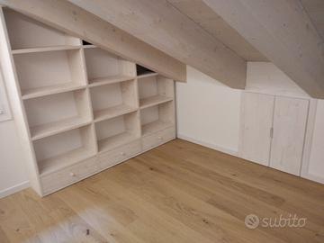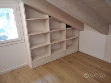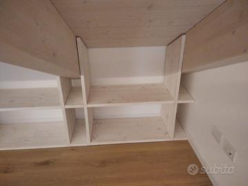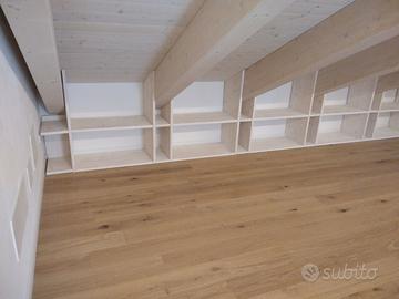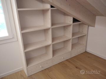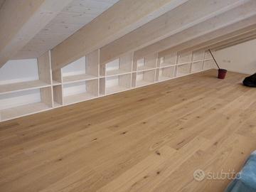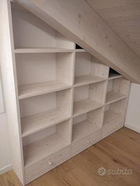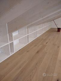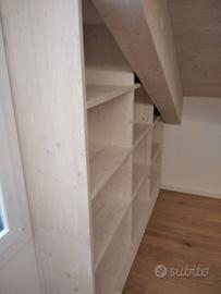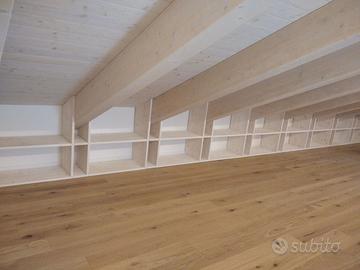 Scaffalatura/libreria a giorno costruita in abete a 3 strati spessore 27 mm tutto a giorno no schienale posteriore. Così composto con lunghezza parete 9 metri h minima posteriore circa 50 cm (sotto trave 80 cm interno trave) da 9 librerie da fianchi dritti inclinati verso angolo del tetto con profondità 40 cm lunghezza cadauna 80 cm. sotto fondo che appoggerà a terra con piedini livellatori per mettere a bolla e ripiano fisso a metà altezza. Tra una libreria e l’altra predisposto 2 ripiani aggiustabili con ferramenta idonea per sfruttare tutto lo spazio. Finitura cerata sbiancata.