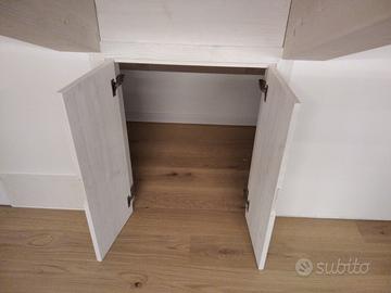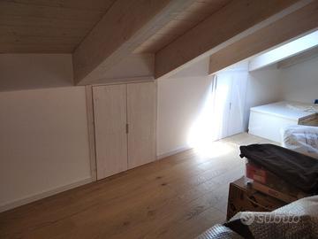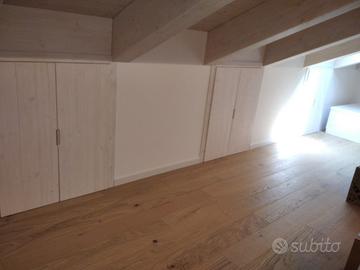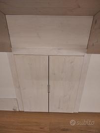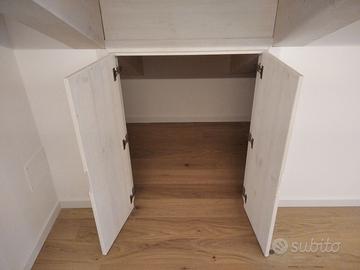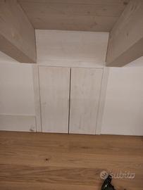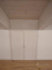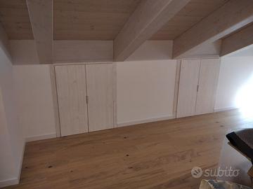 04 porte doppie complete (sottotetto) complete di maestà in abete a 3 strati in modo che non si incurvi nel tempo spazzolato con venature verticali misura lunghezza 83 cm h 163 (per la porta) mentre i 30 cm tamponatura per lo spessore del trave (in modo da far aprire le ante verso interno stanza) con fresata a gola per apertura su cerniere da cucina regolabili e fasce di tamponamento parte a vista.