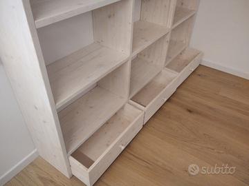01 libreria (stanza ufficio) con fianchi a scalare verso il basso con misura max sfruttabile da muro a finestra lunghezza 180 prof. (spazio tra muro e trave) 30 h da 70 a 165 cm disposta in 3 vani da 60 cm cadauno in cui la parte bassa troveremo 1 cassetto (3 totali) per ogni vano che scorrerà su guide in legno x sfruttare lo spazio parte superiore. Vari ripiani ogni 38 cm circa. Con piedini livellatori per mettere a bolla il tutto e finitura cerata sbiancata.
