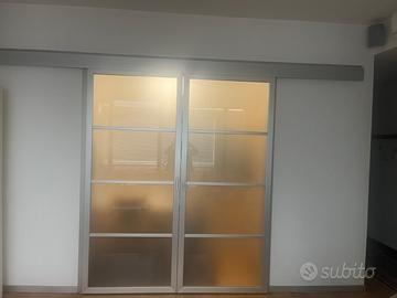 Causa lavori di ristrutturazione vendo doppia porta a scorrimento esterno in vetro e alluminio misura 217hx91 l’una con veletta e meccanismi.