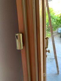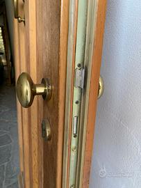 Portoncino d'ingresso in legno massiccio con vetro nella parte superiore dimensioni 94x220cm con apertura a destra serratura funzionante, completo di tre chiavi con battente ad anello e pomoli in ottone struttura sana e robusta, specifico che la parte inferiore del lato esterno presenta uno sbiadimento della finitura dovuto esclusivamente all'esposizione solare, il protoncino era posato in una nicchia quindi protetto da pioggia o intemperie cerniere "Anuba" registrabili, sistema di chiusura multi-punto, con doppia guarnizione perimetrale con telaio (104x231cm) completo di zanche per ancoraggio al muro Prezzo NON trattabile