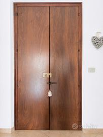 Portoncino d’ingresso in legno massello a due ante, dal design classico con pannellature decorative. Struttura robusta e pesante, ideale per rustici o case di campagna. Completo di maniglione esterno e soglia inferiore. Esternamente presenta normali segni di usura dovuti al tempo e all’esposizione, soprattutto nella finitura superficiale, ma il legno è solido e facilmente restaurabile con una semplice carteggiatura e riverniciatura. La parte interna invece è perfetta e non necessita di alcun intervento. Venduto senza telaio, facilmente adattabile su telaio esistente o con possibilità di realizzarne uno su misura. Misure: - h 255 cm -l 120 €250 trattabili