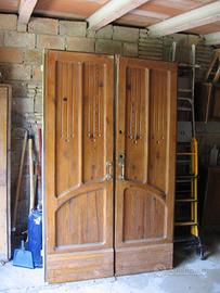Portoncino liberty da esterno, epoca 1900-1930, in larice, recuperato da una villa nobiliare marchigiana. Legno in condizioni eccellenti, maniglie in ottone. Misure h cm 200, l totale cm 160 circa.