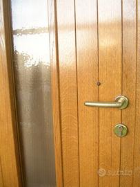 Vendo portoncino da esterno in rovere massiccio spessore 5 cm composto da 2 fissi laterali apribili e porta centrale di accesso e sopraluce cieco (eventualmente asportabile). Dimensioni complessive 170 base x 270 altezza compreso sopraluce da 40 cm. Vetratura satinata doppia camera, spazzolino inferiore anti-spifferi, serratura a nastro con chiave doppia mandata, maniglia interna e pomolo esterno.
